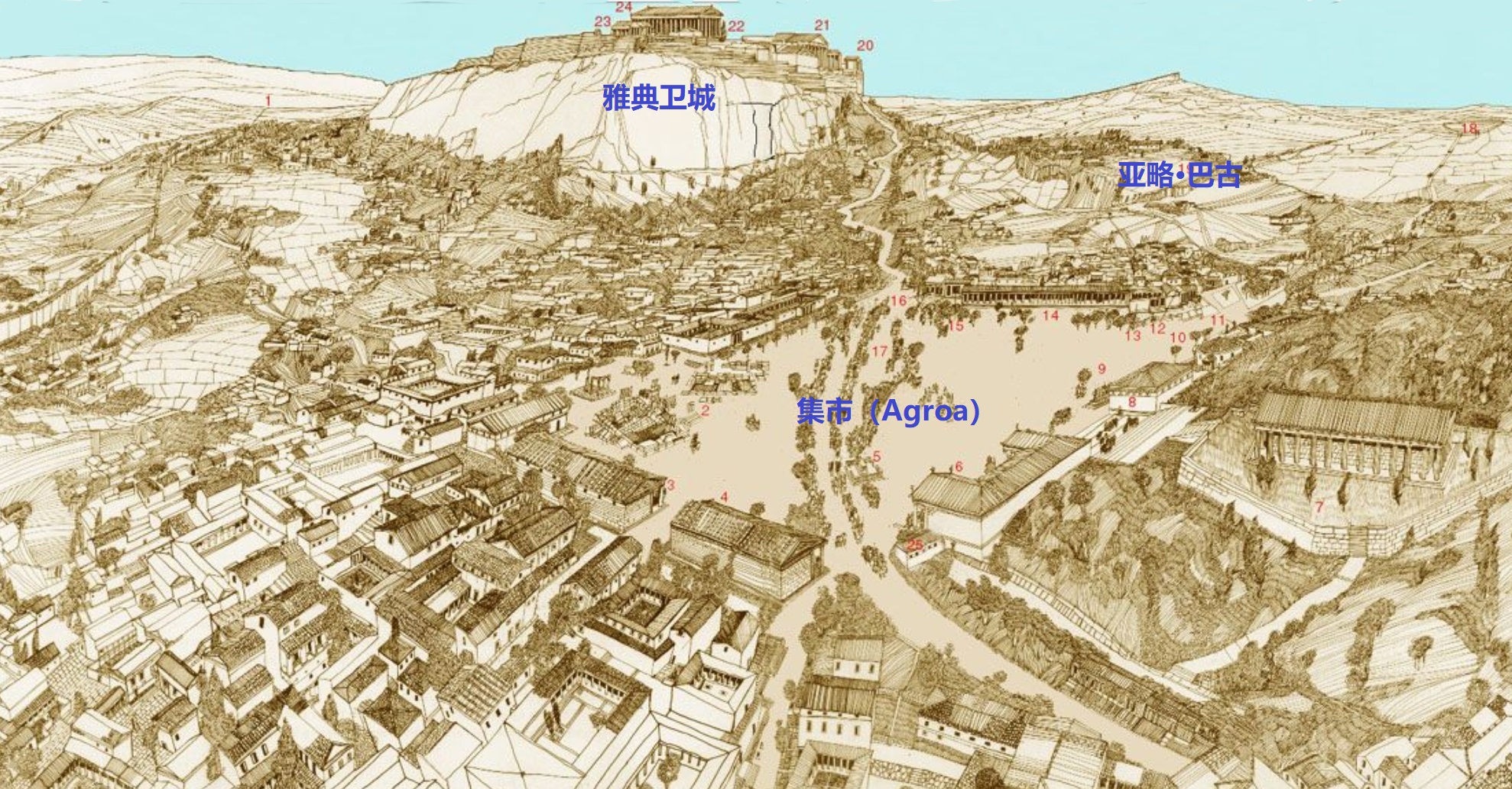 - 「市上 ἀγορά/agora」(17节),指集市。这是雅典的公共广场,周围有各种政府、商业和宗教建筑,彼此之间通过柱廊连通,成了雅典人日常生活、工作、娱乐和集会的中心。雅典人聚集在这里打听新闻、讨论各种话题,许多知识精英、文人哲士和游学教师也出没于此。