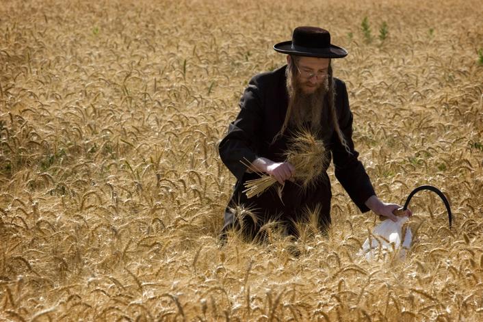 上图:一位正统犹太人用镰刀割麦子庆祝五旬节。