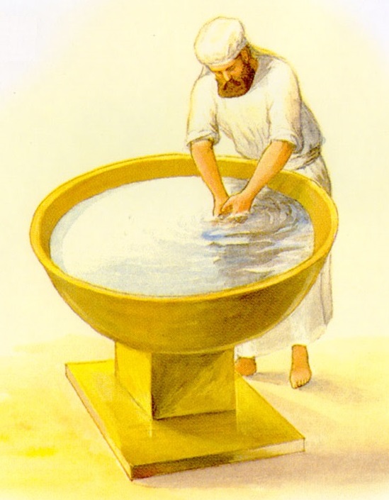 - 祭司在承接圣职时一次「用水洗身」(二十九4)还不够,每天进会幕或献祭之前,还需要在铜做的「洗濯盆」里「洗手洗脚」(19节),「免得死亡」。