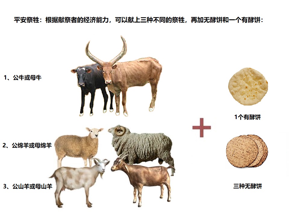- 第一种「平安祭」是「没有残疾」的牛。「燔祭」只能用公的牲畜,但「平安祭」可以用「公的」或「母的」,可能因为「平安祭」的祭牲只需要将脂油、腰子和肥尾巴烧在坛上。如果祭牲的肉需要烧在坛上,就必须是公的,象征儿子。