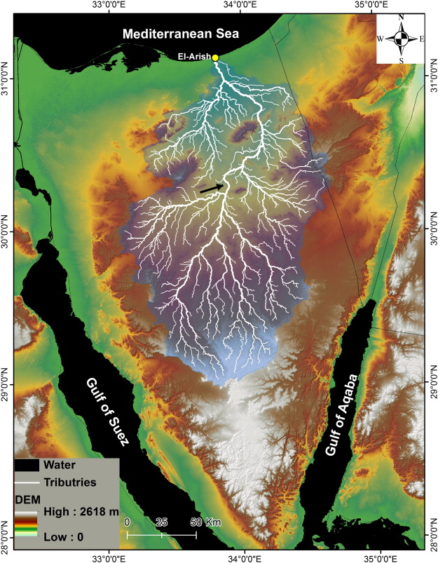 - 应许之地的南界是从「盐海」向西穿过「加低斯·巴尼亚」(4节)、「埃及小河」,一直到地中海。「盐海」(3节)就是死海,「海」、「大海」(6节)就是地中海,「埃及小河」是阿里什旱溪(Wadi el-Arish)的下游。「亚克拉滨坡、哈萨亚达、押们」(4节)的准确位置不能完全确定。