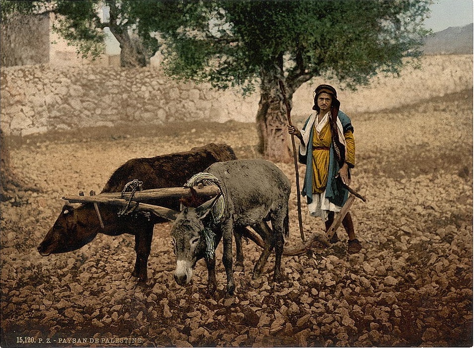 上图:1890年的照片,一位巴勒斯坦人正在用牛和驴一起耕地。类似的照片还有许多,都收藏于美国国会图书馆(Library of Congress),表明牛和驴一起耕地,并没有技术上的难题。