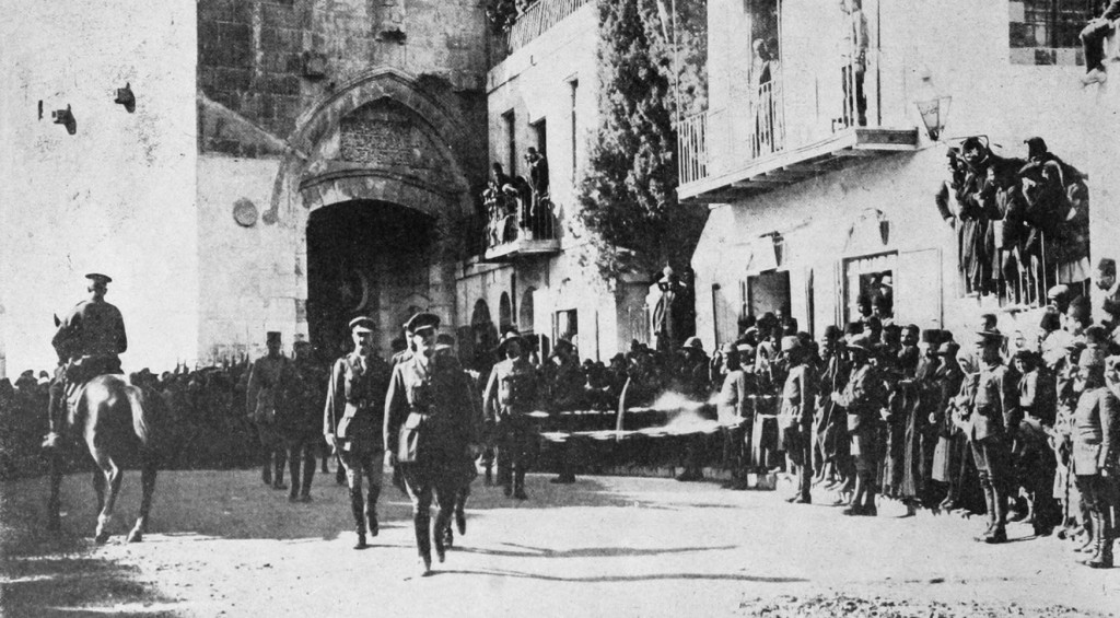 上图:在第一次世界大战的末尾,英国Allenby将军打败了奥斯曼、德国联军,于1917年12月11日进入了被奥斯曼帝国控制了500年的耶路撒冷,揭开了犹太人回归的序幕。