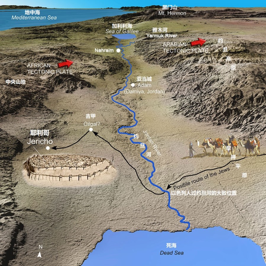 【书三16】「那从上往下流的水便在极远之地、撒拉但旁的亚当城那里停住,立起成垒;那往亚拉巴的海,就是盐海,下流的水全然断绝。于是百姓在耶利哥的对面过去了。」