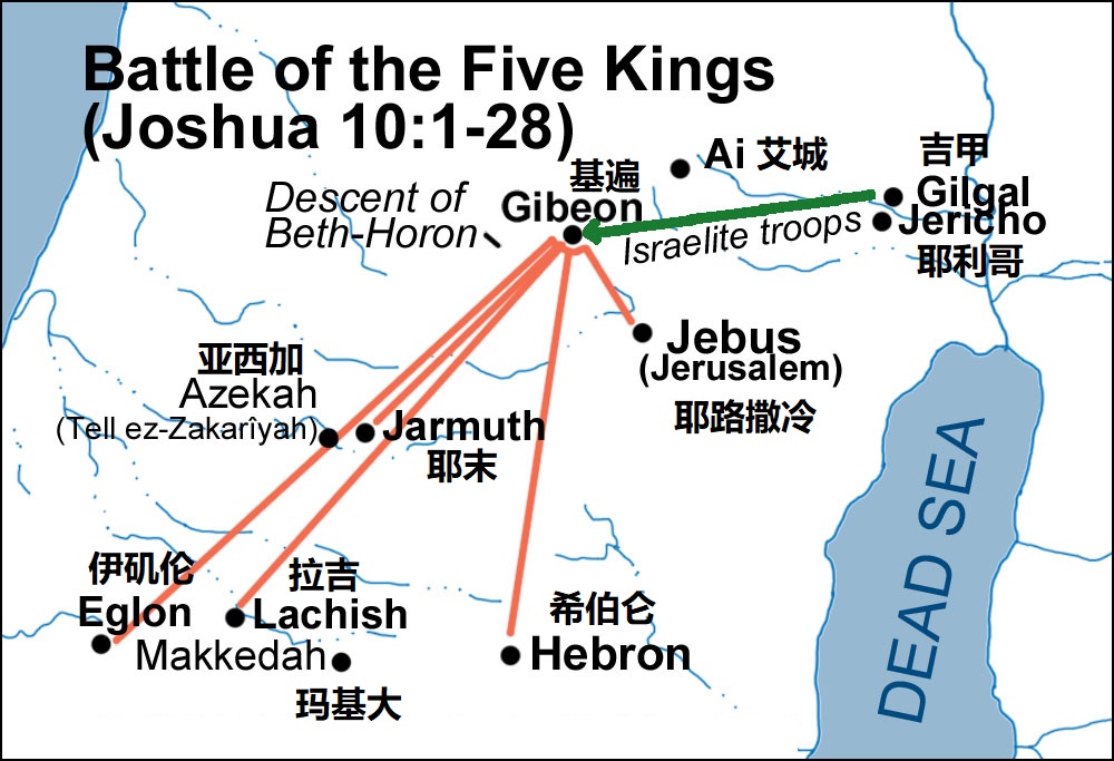 - 「耶路撒冷、希伯仑、耶末、拉吉、伊矶伦」(5节)都位于基遍的南方。基遍离耶路撒冷只有13公里,扼守从约旦河谷经中央山地向西到沿海平原的东西大道,不但控制着迦南地的东西要道,而且直接威胁到耶路撒冷,所以耶路撒冷王必须联合南方诸王「攻打基遍」(5节)。