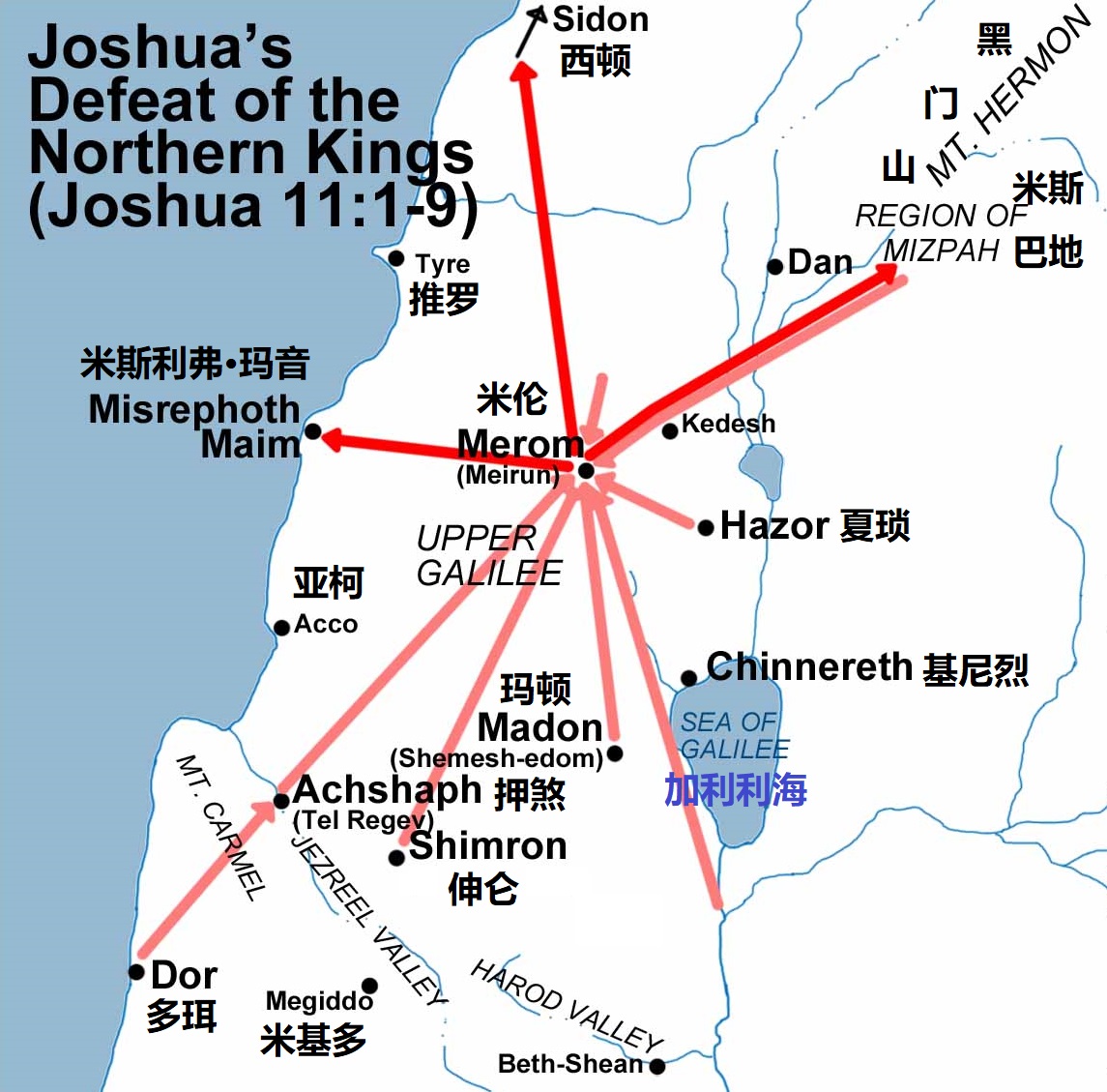 - 南方五王联军都是「亚摩利人」(十6),但北方诸王联军则由许多的种族组成(3节)。「基尼烈」(2节)字义是竖琴,位于加利利海的西北岸。「亚拉巴高原」(2节)指约旦河谷的丘陵地带。「多珥」(2节)位于西边地中海沿岸迦密山附近。「黑门山」(3节)是迦南地北方最高的山。「米伦水」(5节)是上加利利的一条溪水。