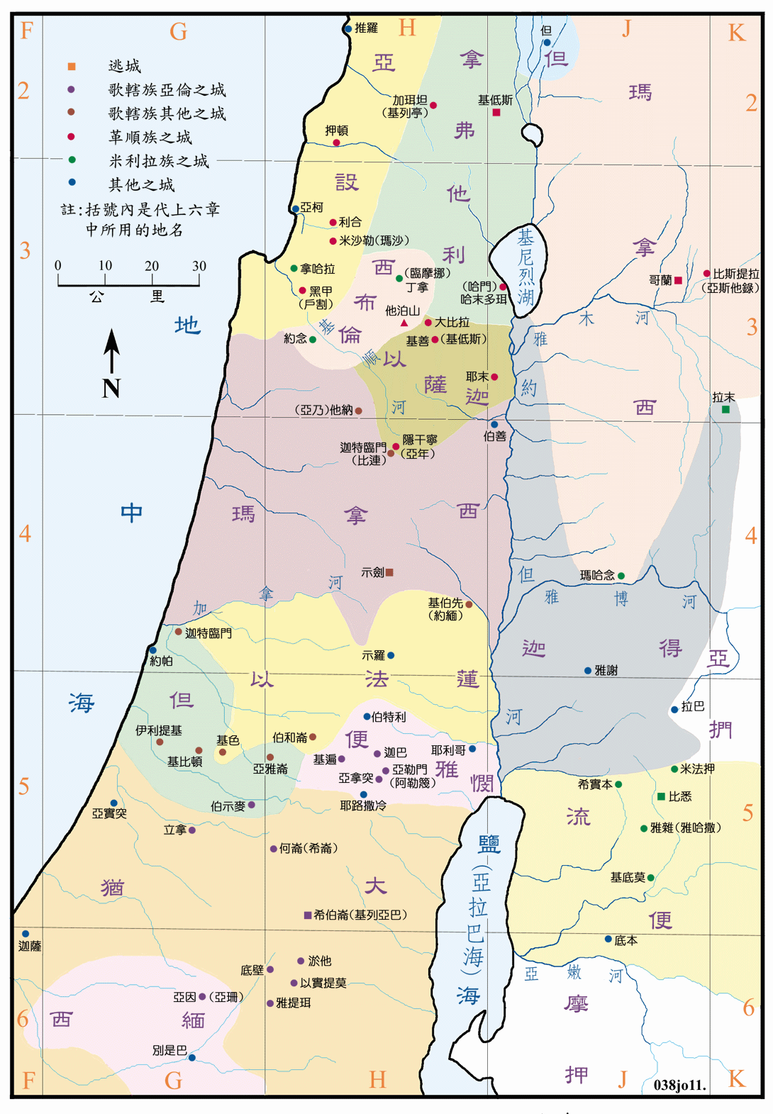 - 「革顺的子孙」(27节)从以萨迦、亚设、拿弗他利和约旦河东的玛拿西半个支派得了十三座城,其中有两座逃城。