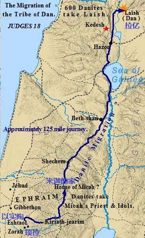 上图:但族中的六百人离开南方但支派的产业,走了大约200公里,到北方攻取了拉亿。