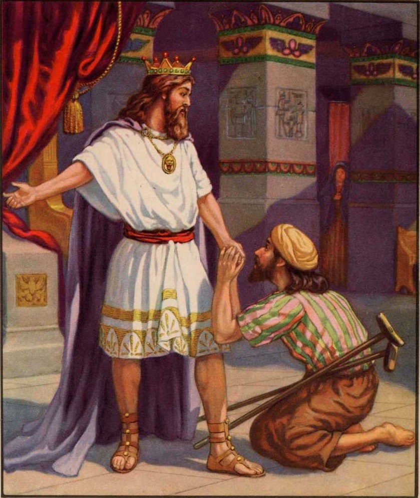 【撒下九7】「大卫说:『你不要惧怕,我必因你父亲约拿单的缘故施恩与你,将你祖父扫罗的一切田地都归还你;你也可以常与我同席吃饭。』」