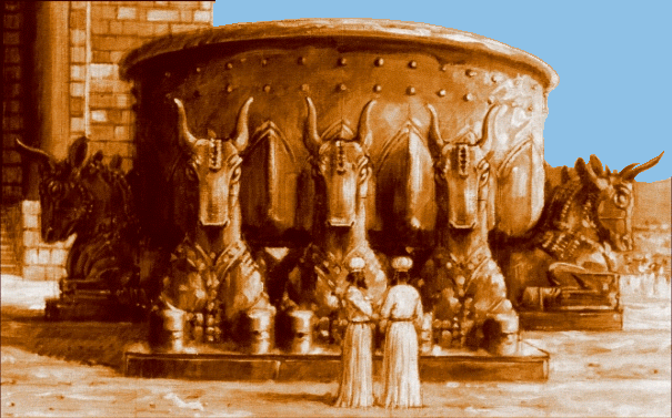 【代下四4】「有十二只铜牛驮海:三只向北,三只向西,三只向南,三只向东;海在牛上,牛尾向内;」
