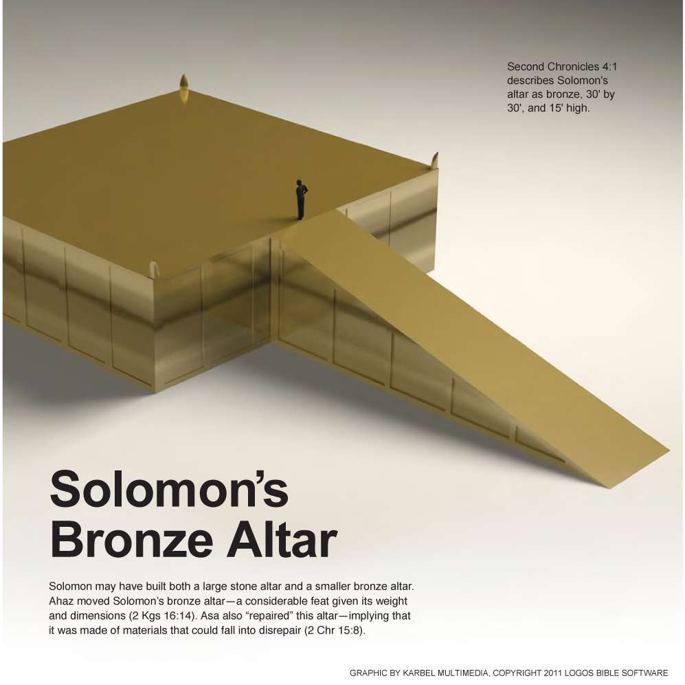 - 「铜坛」(1节)就是燔祭坛(出二十七1;三十八1)。《列王纪》中只提到铜坛(王上八64),却没有提到尺寸,但《历代志》特地指出,这铜坛「长二十肘,宽二十肘,高十肘」(1节)。如果按「古时的尺寸」(三3),大约长宽都是10.4米,高度5.2米,有一层半楼那么高,非常庞大。