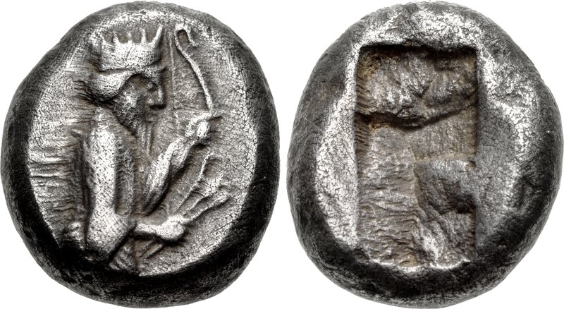 上图:大流士一世时代的波斯帝国银币锡格洛斯(Siglos),重约5.4-5.6克,含银量是97-98%。正面是大流士王拿着弓和箭,背面是一个长方形的戳印。1达利克金币折合20锡格洛斯银币。