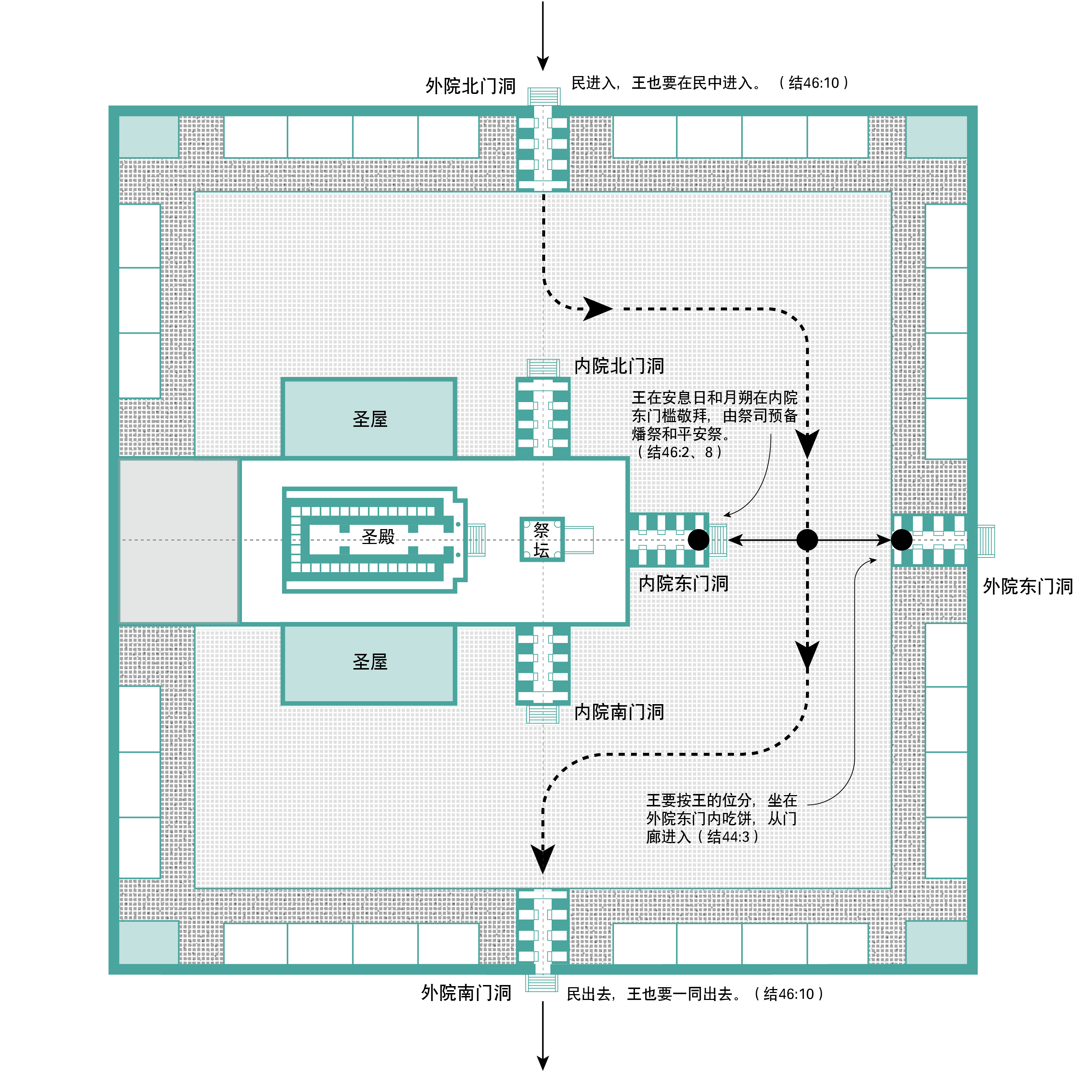- 当神的荣光从东门进入圣殿之后(2节;四十三4),外院的东门就「必须关闭,不可敞开,谁也不可由其中进入」(2节),以免被玷污。百姓只能从北门和南门进入外院,目的就是分别为圣。