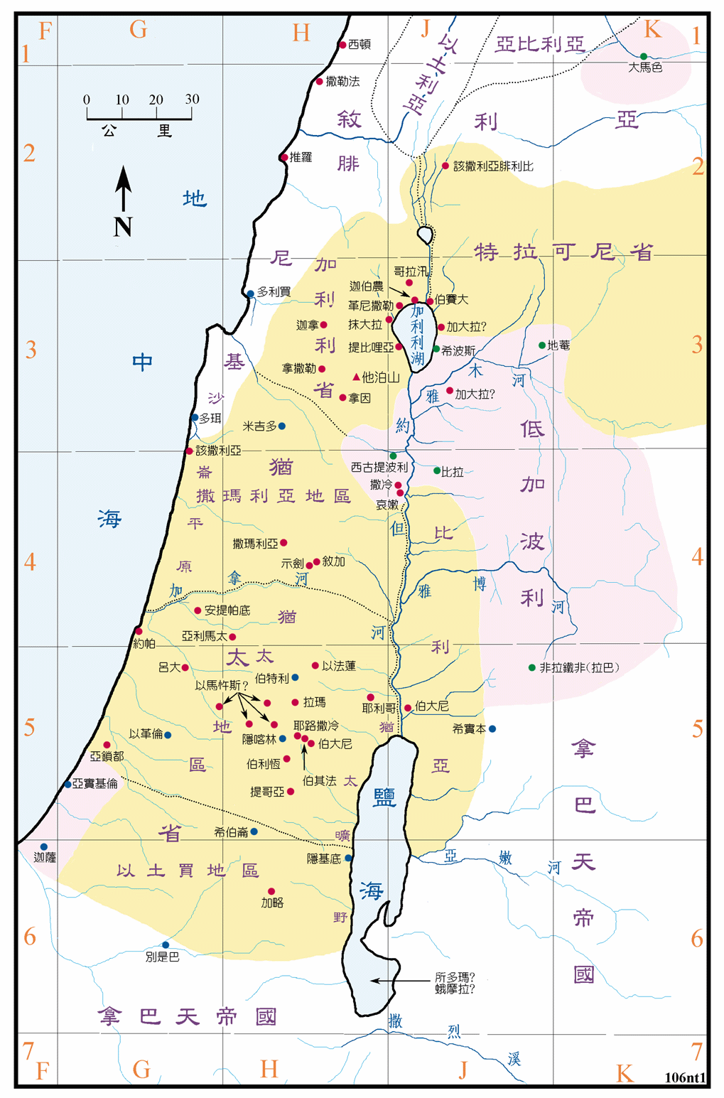 - 「以法莲地」(19节)位于耶路撒冷北边的以法莲支派境内,「撒马利亚地」(19节)位于以法莲地北边的玛拿西支派境内,「基列」(19节)位于约旦河东。这三处原来都是北国以色列的土地,犹大被掳回归以后,于主前二世纪被犹大的马加比王朝占领。