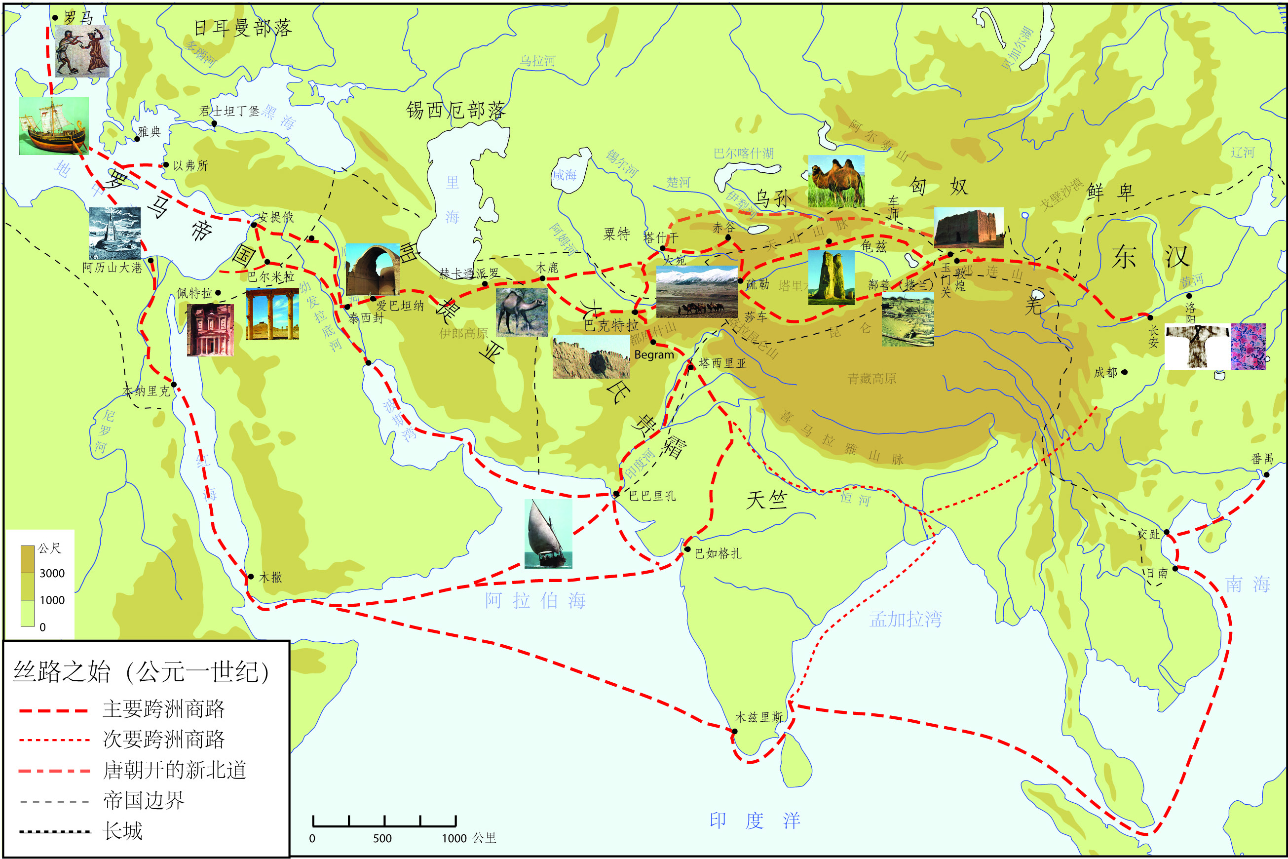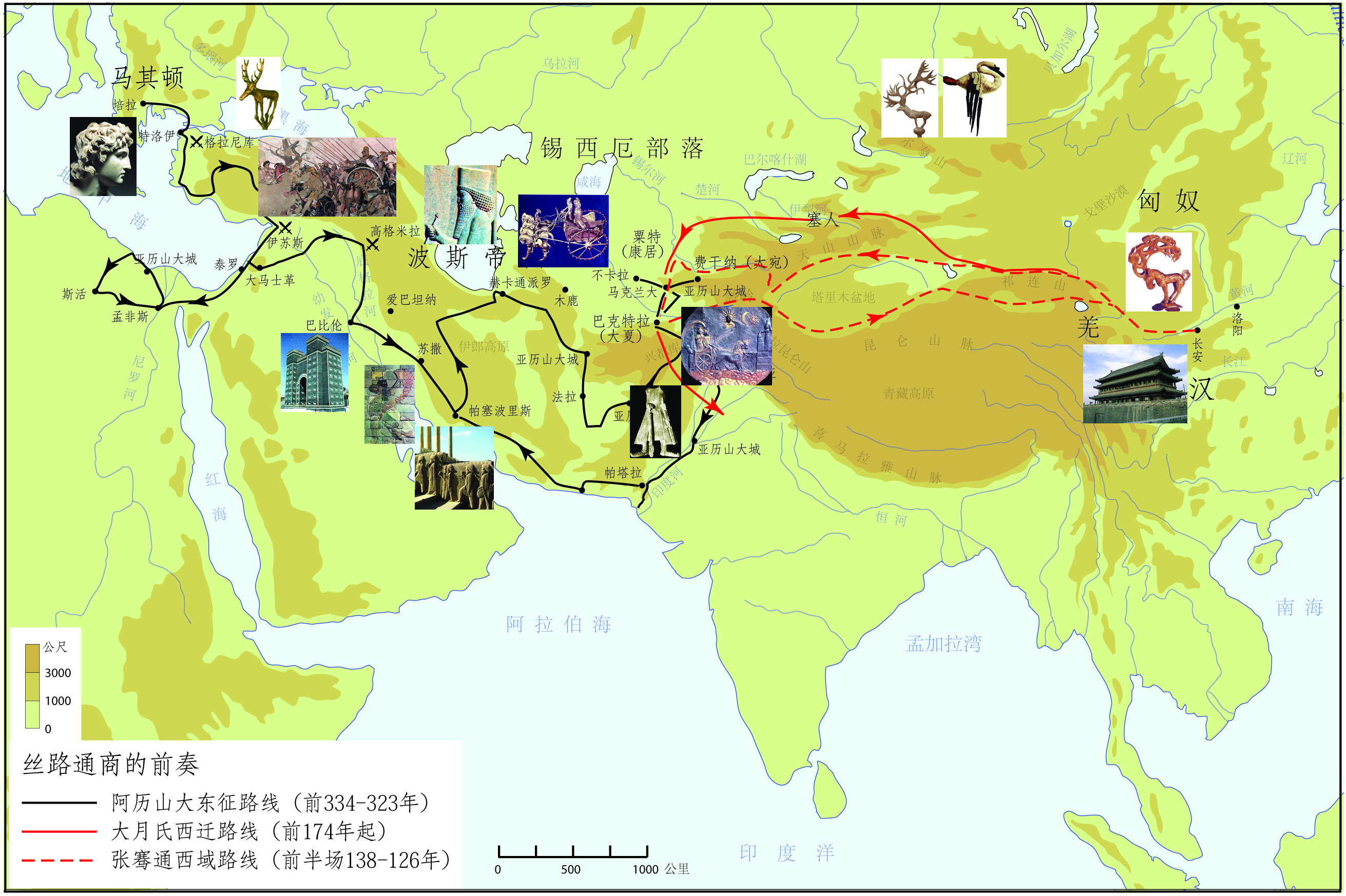 在这四百多年里,神不忙,人却很忙,印度出现了释迦牟尼(约主前480-400年),希腊出现了苏格拉底(约主前470-399年)、柏拉图(约主前427-347年)、亚里士多德(约主前384-322年),中国出现了诸子百家,亚历山大(主前356-323年)、凯撒(主前100-44年)、秦始皇(主前259-210年)、汉武帝(主前156-87年)等伟大的君王也都粉墨登场。在西方,波斯、希腊、罗马帝国相继成为横跨欧亚非的大帝国,地中海沿岸道路通畅,希腊文成为通行的国际语言。在东方,孔雀王朝统一了印度,中国进入「车同轨、书同文」的大一统时代。人类在这段时期的宗教、哲学、文学、艺术、法律和建筑方面的文化成就,奠定了现代文明的基础,连接东西方文明的丝绸之路也被开通了。
